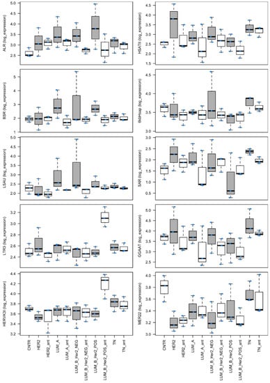 Breast cancer is still the leading cause of mortality among the female population in developed countries. In post-menopausal women, it accounts for 23% of all cancer deaths []. Breast cancers can be classified following anatomical, histological and molecular features [], and their classification is a dynamic process, as stated in the last World Health Organization classification of tumors of the breast [], and novel entities are added to the classification year by year following the increase in the knowledge of the disease []. Breast cancer is as a heterogeneous disease with different clinical and pathological features, variable therapeutic approaches and responses and with different outcomes even within the same class of breast cancer, suggesting that the current classifications are far from exhaustive. In order to follow the original classification of the cohort used in this study [,], the breast cancer specimens have been classified as: luminal-A, luminal-B (HER2-negative), luminal-B (HER2-positive), HER2-enriched and triple-negative breast cancers. This classification is based on immunohistochemical-relevant markers and was recommended by the St. Gallen Expert Consensus [] and it has become a standard in routine clinical analysis since then [,,]. For detail reviews, please refer to Hennigs et al. [] and Prat et al. [].
