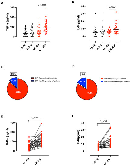 S1P induced the release of TNF-α and IL-6 from lung cancer-, but not from healthy-derived PBMCs. Healthy volunteers (H)- and lung cancer (LK)-derived PBMCs were stimulated with S1P (10 nM) and the release of TNF-α (A) and IL-6 (B) was evaluated after 8 h of treatment. n = 29 H and n = 54 LK were tested for TNF-α (A); n = 24 H and n = 53 LK were tested for IL-6 (B). (C) 85.2% of LK patients (red slice) were responsive to S1P treatment releasing TNF-α whereas, 14.8% (blue slice) of LK patients were not responsive to S1P stimulation. (D) 86.8% of LK patients (red slice) were responsive to S1P in terms of IL-6 release, whereas 13.2% (blue slice) of LK patients were not responsive. The mean delta (Δm) of increment of the TNF-α levels after S1P stimulation was of 9.7 compared to controls (E). (F) The release of IL-6 from lung cancer-derived PBMCs after S1P addition showed a Δm of increment of 5.4 compared to controls. The Δm of increment was calculated as Δm = [(Cytokine levels after S1P addition-basal control)/basal control]/total number of patients. Basal control corresponded to non-stimulated cells. Data are represented as scatter dot plots indicating the median (confidence interval = 95%). Statistical differences were assessed by means of two-tailed Wilcoxon matched-pairs signed rank test.
