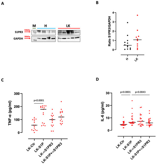 Because S1P carries out its biological effect by interacting with its surface receptors (S1PRs) [1], we went on to evaluate their expression on H- and LK-derived PBMCs. S1PR3 was the most expressed receptor (Figure 2A), likewise previously observed on structural cells [5]. Whereas S1PR1 and S1PR2 were not detected on PBMCs (data not shown). Of note, S1PR3 was over-expressed on LK-isolated PBMCs compared to H-isolated PBMCs (Figure 2A,B). To understand whether S1P-induced pro-inflammatory cytokine release was dependent on this receptor, we treated PBMCs with a S1PR3 antagonist (αS1PR3, 10 µM) in the presence of S1P. The inhibition of S1PR3 led to an evident, but not statically significant, reduction of S1P-induced TNF-α (S1P median: 178.4 pg/mL vs S1P+αS1PR3 median: 119.5 pg/mL) (Figure 2C). Instead, S1P-derived IL-6 release was significantly reduced in the presence of an S1PR3 antagonist (Figure 2D), implying that the pro-inflammatory activity of S1P on PBMCs is mainly mediated by S1PR3.