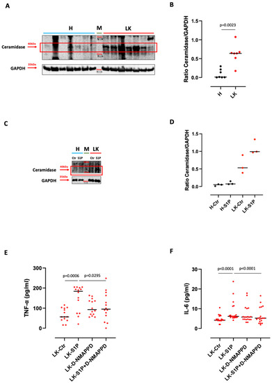 S1P-induced pro-inflammatory cytokine release was ceramidase dependent. (A) Western blotting shows that healthy volunteers (H)-derived PBMCs expressed lower levels of ceramidase active form (40 kDa) compared to lung cancer (LK)-derived PBMCs. GAPDH was used as a loading control. The experiment was repeated three times. M refers to the protein molecular weight marker. (B) Ceramidase active form expression analysis was performed by ImageJ software (NIH, USA) and expressed as a ratio between ceramidase and GAPDH. (C) One-hour S1P-stimulated LK-derived PBMCs over-expressed the ceramidase in its active form (40 kDa) compared to control (Ctr) and to H-isolated PBMCs. GAPDH was used as a loading control. The experiment was repeated three times. M refers to the protein molecular weight marker. (D) Ceramidase active form expression analysis was performed by ImageJ software (NIH, USA) and expressed as a ratio between ceramidase and GAPDH. Ceramidase inhibition by means of D-NMAPPD (5 µM) significantly reduced the release of TNF-α (E) and IL-6 (F) from LK-derived PBMCs, after S1P (10 nM) addition. n = 14 LK matched-pair samples were tested for TNF-α (E) and n = 19 matched-pair samples were tested for IL-6 (F). Data are represented as scatter dot plots indicating the median (confidence interval = 95%). Statistical differences were assessed by means of a two-tailed Wilcoxon matched-pairs signed rank test.