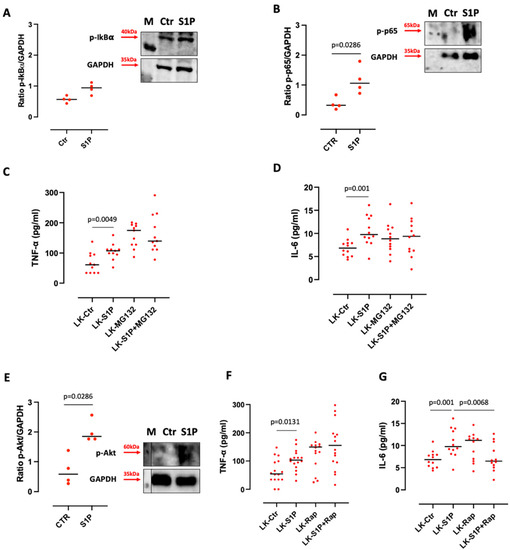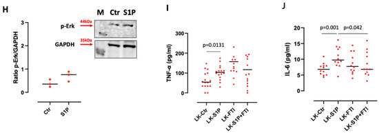 Akt/mTOR and K-Ras/Erk pathways were involved in the S1P-induced IL-6 release. One-hour S1P-treated lung cancer (LK)-derived PBMCs over-expressed phospho-IkBα (p-IkBα; 40kDa) (A) and phospho-NF-κB p65 (p-p65; 65kDa) (B) compared to control. GAPDH was used as loading control. M refers to the protein molecular weight marker. The experiment was repeated four times. NF-κB inhibition by means of MG132 (10 µM) did not reduce the release of TNF-α ((C), n = 11) and IL-6 ((D), n = 12) from LK-isolated PBMCs after S1P addition. (E) One-hour S1P-treated LK-derived PBMCs over-expressed phospho-Akt (p-Akt; 60kDa) compared to control. GAPDH was used as a loading protein. M refers to the protein molecular weight marker. The experiment was repeated four times. The inhibition of mTOR by means of Rapamicin (Rap, 100 ng/mL) reduced IL-6 ((G), n = 12), but not S1P-induced TNF-α release ((F), n = 16). (H) One-hour S1P-treated LK-derived PBMCs over-expressed phopho-Erk (p-Erk; 44 kDa) compared to control (Ctr). GAPDH was used as loading protein. M refers to protein molecular weight marker. The experiment was repeated three times. The inhibition of K-Ras by means of FTI-276 (FTI, 2 µg/mL) reduced IL-6 ((J), n = 12), but not S1P-induced TNF-α release ((I), n = 16). All samples were matched-pairs. Data are represented as scatter dot plots indicating the median (confidence interval = 95%). Statistical differences were assessed by means of two-tailed Wilcoxon matched-pairs signed rank test.