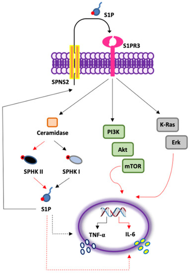 - The activation of S1PR3 by the exogenous S1P induces the release of TNF-α in a SPHK I-dependent manner, and of IL-6 via SPHK I/II;