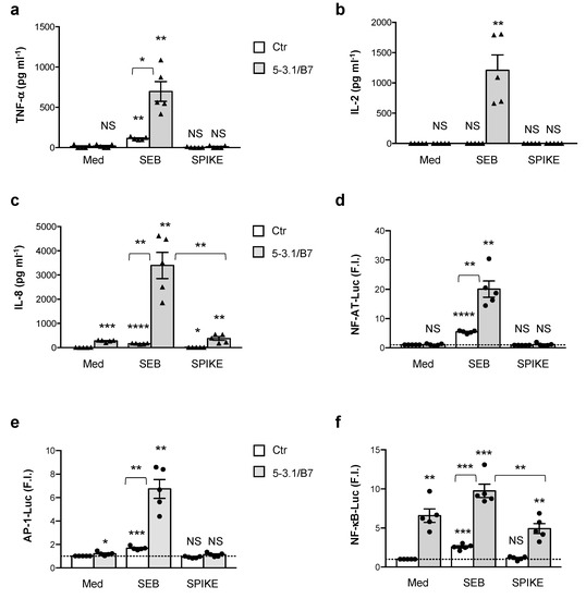 Then, 107 Jurkat cells were electroporated at 260 V, 960 µF in 0.5 mL RPMI 1640 medium supplemented with 10% FBS with 2 μg of NF-κB-luciferase or 10 μg of NF-AT-luciferase or the AP-1 luciferase constructs together with 5 μg of the pEGFP construct, keeping the total amount of DNA constant (30 µg) with an empty vector. After 24 h, the cells were stimulated with 5-3.1/B7 cells in the presence or absence of SEB or the SARS-CoV2 spike (1 μg mL−1) at 37 °C for 6 h. The luciferase activity was measured according to the manufacturer’s instructions (Promega). The luciferase activity, measured in triplicates, was expressed as fold inductions (F.I.) after the normalisation to GFP values.