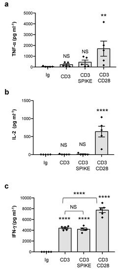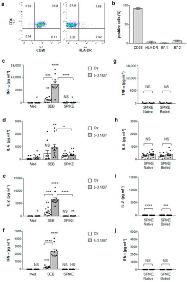 Since Vβ skewing in children with MIS-C involves TCRVβ21.3 (TRBV11-2), 24.1, and 11.3 [20,21,22,69], which are not signature targets of SEB [70], we next analysed the SAg-activity of the SARS-CoV-2 spike T cells isolated from the peripheral blood of healthy donors (HD), which express all TCR Vβ-families, including those amplified in MIS-C [71]. As we have previously observed [38], peripheral blood CD4+ T cells from HD expressed high levels of CD28 (mean = 92) but very low levels of HLA-DR (mean = 3.4), B7.1/CD80 (mean = 1) and B7.2/CD86 (mean = 6.8) molecules (Figure 2a,b). The stimulation of CD4+ T cells with SEB alone induced the significant production of TNF-α (mean = 1393 pg mL−1), IL-6 (mean = 456 pg mL−1), IL-2 (mean = 1467 pg mL−1), and IFN-γ (mean = 258 pg mL−1), which strongly increased in the presence of 5-3.1/B7 cells (Figure 2c–f). Conversely, the SARS-CoV-2 spike only induced a mild increase in TNF-α (mean = 117 pg mL−1) and IL-6 (mean = 256 pg mL−1) that did not further increase to the massive levels induced by SEB when 5-3.1/B7 cells were added to the culture (TNF-α, SEB = 8907, spike = 112; IL-6, SEB = 946, spike = 342) (Figure 2c,d). No significant IFN-γ production was detected following the stimulation of CD4+ T cells with the SARS-CoV-2 spike neither alone nor in the presence of 5-3.1/B7 cells (Figure 2f) and very low levels of IL-2 (mean = 36 pg mL−1) were detected when the T cells were stimulated with the SARS-CoV-2 spike in the presence of 5-3.1/B7 cells (Figure 2e). To exclude the possibility that SARS-CoV-2 spike folding could interfere with the exposure of the TNSPRRAR SAg-like motif and the putative TCR/CD28 binding as well as the activation of CD4+ T cells [19], we also stimulated T cells with a heat-denatured SARS-CoV-2 spike (boiled) and we did not detect any significant change in the secretion of inflammatory cytokines compared to the native form (Figure 2g–j). Since the superantigen-like insert of the SARS-CoV-2 spike has been described to bind to CD28 costimulatory molecules [19], we tested the potential costimulatory activity of the SARS-CoV-2 spike to trigger second-order superantigenic responses [63] in anti-CD3 stimulated T cells. Consistent with previous data [41,44], a significant production of TNF-α (Figure 3a, mean = 1699 pg mL−1) and IL-2 (Figure 3b, mean = 638 pg mL−1) was only induced when CD3 and CD28 were co-engaged. CD3 stimulation also induced an IFN-γ production (Figure 3c, mean = 4403 pg mL−1) that significantly increased following CD28 engagement (mean ± SEM = 7282 pg mL−1). On the contrary, no significant increase in TNF-α (Figure 3a), IL-2 (Figure 3b), and IFN-γ (Figure 3c) was observed when the CD4+ T cells were stimulated with anti-CD3 Abs in the presence of the SARS-CoV-2 spike.