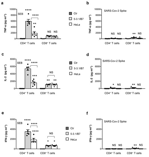 Finally, since the expansion of TCRVβ21.3 in MIS-C patients has been recently associated with three HLA class I alleles (A02, B35 and C04), we compared the SAg activity of SEB and the SARS-CoV-2 spike in CD4+ or CD8+ T cells stimulated with 5-3.1/B7 cells or HeLa cells stably transfected with the HLA-A*0201 allele [52]. The stimulation of CD4+ T cells with SEB in the presence of HeLa cells (Figure 4a,c,e) induced a high production of TNF-α (mean = 1886 pg mL−1), IL-2 (mean = 1557 pg mL−1), and IFN-γ (mean = 1846 pg mL−1), although significantly lower than that induced by 5-3.1/B7 cells (TNF-α mean = 5915 pg mL−1; IL-2 mean = 5377 pg mL−1; IFN-γ mean = 3501). A significant up-regulation of IL-2 (Figure 4c) and IFN-γ (Figure 4e) was also observed in the CD8+ T cells stimulated with SEB in the presence of both 5-3.1/B7 cells (IL-2 mean = 1103; IFN-γ mean = 655.7) and HeLa cells (IL-2 mean = 1088; IFN-γ mean = 653). On the contrary, no significant TNF-α (Figure 4b), IL-2 (Figure 4d), or IFN-γ (Figure 4f) were detected following the stimulation of CD4+ or CD8+ T cells with the SARS-CoV-2 spike in the presence of HeLa cells.