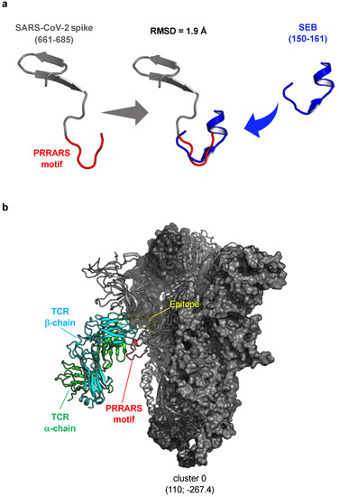 - Cheng, M.H.; Zhang, S.; Porritt, R.A.; Rivas, M.N.; Paschold, L.; Willscher, E.; Binder, M.; Arditi, M.; Bahar, I. Superantigenic character of an insert unique to SARS-CoV-2 spike supported by skewed TCR repertoire in patients with hyperinflammation. Proc. Natl. Acad. Sci. USA 2020, 117, 25254–25262. [Google Scholar] [CrossRef]