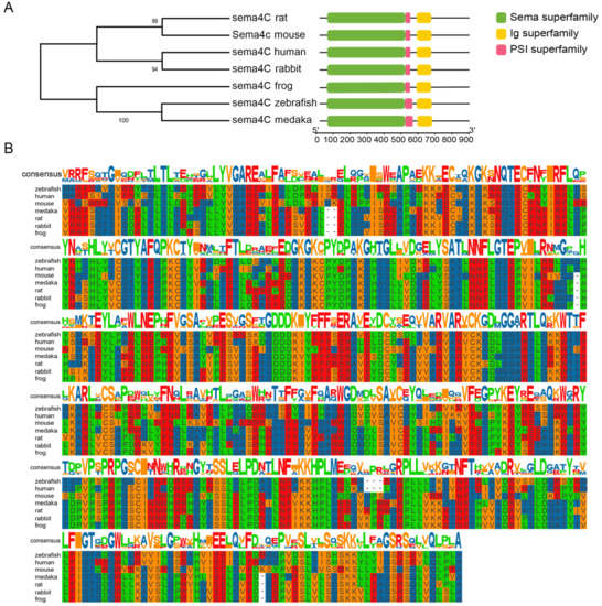 We examined sema4C protein phylogeny in zebrafish (NP_001121718.1) and other representative species, including medaka (Oryzias latipes, NC_019867.2), frog (Xenopus tropicalis, NC_030679), rabbit (Oryctolagus cuniculus, NC_013670.1), mouse (Mus musculus, NC_000067), rat (Rattus norvegicus, NC_051344.1) and human (Homo sapiens, NC_000002.12). The results of the phylogenetic tree show that the sema4C from zebrafish and medaka were clustered in different clades from rodents and primates (Figure 1A). In addition, the sema4C proteins are highly conserved during evolution, especially the sema domain, which suggests their important functions (Figure 1B).