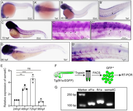 Expression of sema4C gene in embryonic zebrafish at different stages. (A). Whole mount in situ hybridization (WISH) analysis of sema4C in zebrafish embryos and the magnified image of the head at 24 hpf (A’); (B–D). WISH analysis of sema4C in zebrafish embryos and the magnified images of the trunk at 48 hpf (B’), 72 hpf (C’,C”) and 96 hpf (D,D’), black arrow-heads indicate blood vessels; (E). Expression analysis of sema4C genes in embryonic zebrafish at different stages by QRT-PCR. Triangles, squares, dots and diamonds represent data at different time points respectively. One-way ANOVA, *** p < 0.001, ** p < 0.01, ns, no significance; (F). The procedure of the endothelial cells sorting and RT-PCR; (G). The agarose gel electrophoresis results of RT-PCR on fli1a-EGFP sorted cells.