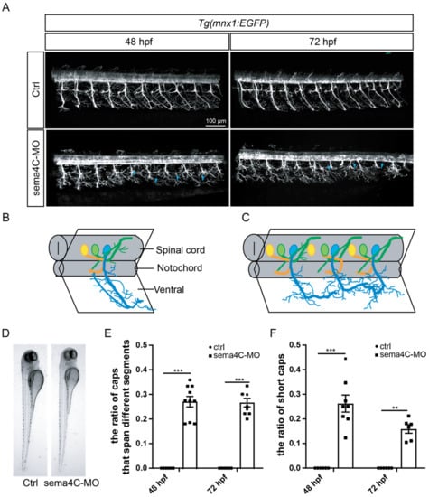sema4C is expressed throughout the nervous system during the development of zebrafish, and particularly highly expressed in the basal parts of the fore-, mid- and hindbrain []. Therefore, it is reasonable to speculate it may regulate the axonal projection of neurons. To determine the roles of sema4C during zebrafish motor neuron development, specific morpholino antisense oligonucleotide (sema4C-MO) was used to knock down the expression of sema4C. The results of RT-PCR proved that the sema4C-MO could efficiently disrupt the exact transcription of sema4C (Supplementary Figure S1). Confocal microscopy analysis demonstrated that the deficiency of sema4C resulted in significant developmental defects of PMNs at 48 and 72 hpf (Figure 3A), while these injected zebrafish embryos were generally normal (Figure 3D). In particular, the axonal trajectories of caudal primary motor neurons (Caps) were dramatically misled in the sema4C morphants (Figure 3C,E), while the wild types of axons projected to the horizontal myoseptum in an ordered pattern (Figure 3B). In addition, partial PMNs in sema4C morphants were significantly shorter in length and could not be completely recovered until 72 hpf (Figure 3F). Overall, these findings show that sema4C is necessary for the development and navigation of neural networks.