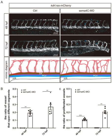 Deficiency of sema4C leads to abnormal vascular networks. (A). Confocal imaging and the schematic diagram of ISVs in the control and sema4C-MO Tg(kdrl:ras-mCherry) zebrafish at different stages. As shown in the diagram, ISVs in the control group were orderly arranged and grew upwards, while ISVs’ growth turned to horizontal germination and connected to adjacent ISVs, or even the opposite ISVs. In sema4C knockdown of zebrafish, blue arrowheads indicate aberrant ISVs; (B). The statistical analysis of the ratio of vessels that crossed different segments in the control and sema4C morphants at different stages—Mann–Whitney test, 48 hpf: ** p = 0.0012; 72 hpf: ** p = 0.0012; (C). The statistical analysis of proliferated vessel ratio in the control and sema4C morphants at different stages—Mann–Whitney test, 48 hpf: *** p = 0.0006; 72 hpf: ** p = 0.0012.
