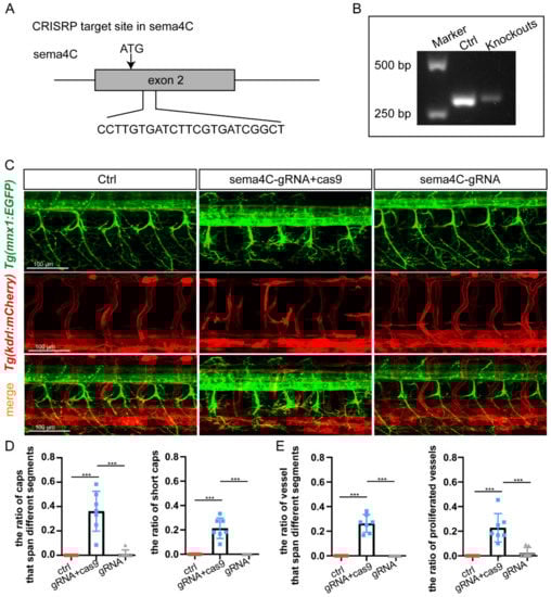 Semaphorins are a large family of secreted and transmembrane proteins, originally studied as axon guidance in the developing nervous system [,]. There are eight subfamilies of semaphorins, among which class 4 semaphorins (sema4) are one of the largest []. Members of sema4 have been well characterized as important regulators in diverse biological events. Sema4D/CD100 have critical roles in the immune system [], nervous development [,], tumor progression [], angiogenesis [,] and skeletal muscle development []. Sema4E is necessary for guiding branchiomotor axons to their targets in zebrafish []. Semaphorins4C (sema4C) is also an important member of sema4, which has been extensively studied in nerve development. sema4C mutant mice displayed obvious cerebellar defects, leading to neonatal death []. Furthermore, studies have demonstrated that sema4C was also implicated in biological events outside the nervous system, such as cell migration [], tumor development [], and terminal myogenic differentiation []. Furthermore, sema4C was found to promote angiogenesis in breast cancer []. sema4C and its preferential receptor Plexin B2 are widely expressed in discrete cell types of several nonneuronal tissues, including endothelia and endocrine cells of mouse [,]. The abovementioned studies indicate that sema4C may participate in endothelial cell behaviors. However, the physiological role of sema4C in vascular development remains unexplored.