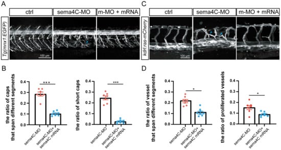 Overexpressing sema4C partially rescued the abnormal of PMNs and ISVs in sema4C deficient embryos. (A). Confocal imaging analysis of PMNs in control and sema4C morphants at 72 hpf, blue arrowheads indicate aberrant PMNs and ISVs; (B). The statistical analysis of the proportion of deficient axonal trajectories of Caps (*** p = 0.0006) and short Caps (*** p = 0.0006) in the sema4C morphants and sema4C rescue groups at 72 hpf. Dots and squares represent the data of the experimental group and the rescue group, respectively. Mann–Whitney test; (C). Confocal imaging analysis of ISVs in control and sema4C morphants at 48 hpf; (D). The statistical analysis of the ratio of vessels that span different segments (* p = 0.035) and the proportion of proliferated vessels (* p = 0.0262) in the sema4C morphants and sema4C rescue groups at 48 hpf. Dots and squares represent the data of the experimental group and the rescue group, respectively. Mann–Whitney test.