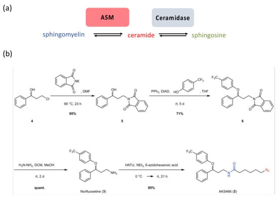 The sphingomyelin pathway and synthesis of compound AKS466. (a) Scheme sphingomyelin pathway, (b) introduction of an amide (blue) and a bio-orthogonal functional group (red) for click-reactions. The compound was synthesized as a racemate and as (R)- and (S)-enantiomers (see Supporting Materials). Abbreviations: DCM: dichloromethane, DIAD: diisopropyl azodicarboxylate, DMF: N,N-dimethylformamide, HATU: 1-[Bis(dimethylamino)methylene]-1H-1,2,3-triazolo [4,5-b]pyridinium 3-oxide hexafluoro-phosphate, THF: tetrahydrofurane.