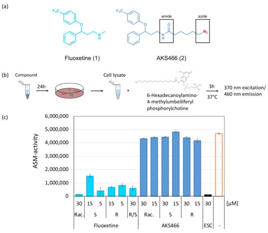 Component AKS466 does not inhibit the ASM activity significantly. (a) Molecular structures of fluoxetine and the derivative AKS466. (b) Scheme of the ASM assay, and (c) ASM assay on Huh-7 cells. The cells were incubated with the compounds for 24 h, lysed, and the HMU-PC substrate was added. The cleavage activity was determined by fluorescence. ESC: escitalopram; Rac: racemate; S and R: stereo-enantiomer; R/S: one to one R/S mixture of stereo-enantiomers.