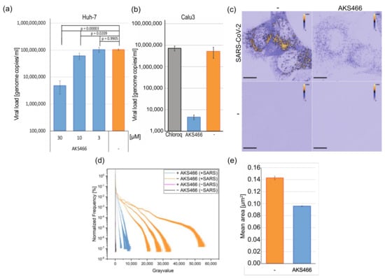 AKS466 inhibits SARS-CoV-2 replication. (a) Huh-7 were incubated with 3, 10, 30 µM AKS466, and (b) Calu-3 cells were incubated with 30 µM AKS466 and infected with 0.5 µL SARS-CoV-2. Cell culture supernatants were harvested after 3 days, and viral loads were determined by RTqPCR. Chloroq: Chloroquine (30 µM). (c) Maximum intensity projections of SARS-CoV-2 FISH confocal fluorescence images of Huh-7 cells. In infected cells (top row), fluorescence intensity decreases upon AKS466 treatment. Only a minor FISH background signal is detectable in non-infected cells (lower row). Scale bar 10 µm. (d) Quantification of relative fluorescence intensity frequencies of RNA FISH signal from SIM raw data from different experiments with SARS-CoV-2-infected (+SARS) and non-infected (-SARS) cells in the presence (+AKS466) and absence (-AKS466) of AKS466. (e) Significant reduction in the mean area of the individual (+)-RNA FISH clusters upon AKS466 treatment in SARS-CoV-2-infected cells.