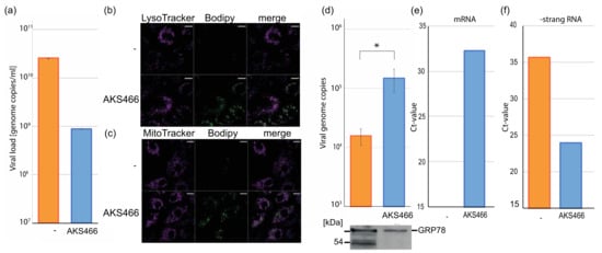 AKS466 is localized in lysosomes and inhibits the release of SARS-CoV-2. (a) AKS466 reduces the viral RNA concentration in the cells. Cells were treated and infected with AKS466, cellular RNAs were isolated, and viral transcripts were quantified by RTqPCR. (b,c) Cells were incubated with 15 µM of AKS466 for 1 h and labelled with 4 µM DBCO-BODIPY for 15 min. Lysosomes and mitochondria were co-stained with LysoTracker (b) or MitoTracker (c), respectively. The significance was calculated with the student’s t-test. (* p < 0.005) . Cells were treated with AKS466. The subcellular localization of AKS466 was visualized by linking BODIPY with a click-reaction to AKS466. Scale bar 4 µm (d–f) Huh-7 cells were treated with AKS466 and infected with SARS-CoV-2. The cells were lysed, and lysosomes were purified. (d) Viral RNAs, (e) mRNAs, and (f) (−) stranded genomic were quantified. Western blotting analyses for GRP78 served as the control for lysosomes on the egress pathway.