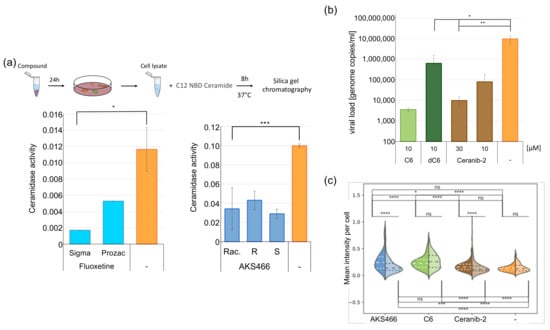 AKS466 and fluoxetine suppress the activity of the acid ceramidase. (a) Cells were incubated with the compounds for 24 h, and ceramidase activity was measured. (b) Ceramides inhibit SARS-CoV-2 replication. Huh-7 cells were incubated with C6 ceramides, the ceramidase inhibitor ceranib-2 or dihydroxyl C6, and infected with SARS-CoV-2. Viral loads were measured by RTqPCR. (c) Determination of cellular ceramides concentrations in Huh7 cells (significance: upper panel) and SARS-CoV-2-infected cells (significance: lower panel) using a ceramide-specific antibody (ns: p > 0.005; *: 0.005 ≥ p > 0.001; **: 0.001 ≥ p > 0.0001; ***: 0.0001 ≥ p > 00001; ****: 0.0001 ≥ p).