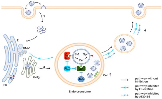 Suggested mechanisms of fluoxetine and AKS466 inhibition. (1) Viral entry by fusion pathway and release of viral RNA into the cytosol. (2) Viral replication and assembly. (3) Transport to endo-lysosomes: acid sphingomyelinase (ASM) acts at intra-luminal vesicles and degrades sphingomyelin (SM) to ceramide (Cer), which is further metabolized by acid ceramidase (AC) to sphingosine (Sph). Fluoxetine (FLX) inhibits ASM and AC, while AKS466 only inhibits AC. We suggest that inhibition of AC and ceramide accumulation leads to viral particle enrichment in endo-lysosomes and prevents release on the endo-lysosomal egress route (4).