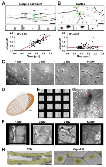 To determine potential intrinsic and extrinsic factors that regulate diameter variation in individual CNS axons, we used primary cultures of hippocampal and cortical mouse neurons combined with Cryo-ET. Rodent primary neuron culture represents the most popular model for cell biological studies of neurons [39,40,41,42]. Hippocampal or cortical neurons from mouse pups (0–1 postnatal days) were differentiated on coated glass coverslips or on the plastic bottom of a cell culture dish as described previously [7,28,33]. At 1 DIV, the neurons demonstrated a few processes; at 3 DIV, one of the processes became significantly longer than the other axons; at 7 DIV, both the axons and dendrites were further elongated; at 14 DIV, the axons and dendrites formed complicated networks, and the synapses started to form (Figure 1C). To visualize the 3D ultrastructure of the axons from these cultured neurons, we cultured them on gold-coated EM grids (Figure 1D). These grids had a thin lacey carbon film layer with holes (0.25–10 μm diameter) to support the disassociated neurons (Figure 1E). On top of the lacey carbon film that was coated with extracellular matrix protein collagen and poly-D-lysine, neurons were still able to differentiate and grow long processes, both axons and dendrites, similar to on the coverslips (Figure 1F). Low-magnification Cryo-EM images showed that whereas electrons cannot pass through thick cellular structures, including neuronal soma and dendrites, there were still many areas with thin and isolated axons that could be resolved in Cryo-ET (Figure 1G). Therefore, our analysis focused on isolated axons with diameters ≤2 μm.