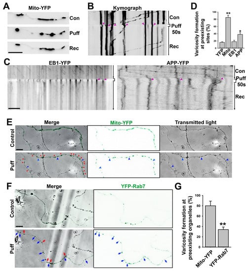 To simultaneously visualize axonal varicosity formation and mito-YFP punctum movement, we performed live-cell imaging with transmitted light (black in gray scale) and YFP fluorescence (green) (Figure 4E). Our result showed that most axonal varicosities (swellings revealed under transmitted light) formed at the sites with preexisting mitochondrial clusters (mito-YFP puncta revealed by YFP fluorescence), whereas only a small fraction of induced axonal varicosities formed without containing any YFP fluorescence signal (Figure 4E,G). Furthermore, we examined YFP-Rab7, which specifically labels late endosomes and MVBs [45,46]. When being expressed in neurons, YFP-Rab7 fluorescence signals were distributed more smoothly throughout axons with sparse clusters where MVBs were most likely localized (Figure 4F). After puffing, some axonal varicosities formed at sites where YFP-Rab7 was clustered, while most varicosities formed at the sites that did not contain YFP-Rab7 clusters before puffing (Figure 4F,G). Thus, comparing mito-YFP and YFP-Rab7, our results indicate that most of the axonal varicosities formed at the sites where mitochondria were located, consistent with our finding that mitochondria were enriched in axonal varicosities when the neurons were cultured on top of the lacey carbon film (Figure 2).