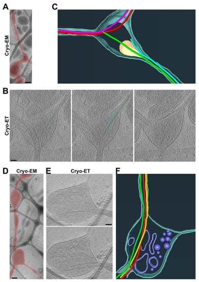 - Hoffmann, P.C.; Giandomenico, S.L.; Ganeva, I.; Wozny, M.R.; Sutcliffe, M.; Lancaster, M.A.; Kukulski, W. Electron cryo-tomography reveals the subcellular architecture of growing axons in human brain organoids. eLife 2021, 10, e70269. [Google Scholar] [CrossRef] [PubMed]