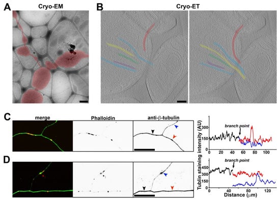 When extending out of the main axon, the thin branch sometimes also contained MT filaments. In an example, out of a total of the six MTs in the main branch, five MTs remained in the main branch, whereas one MT extended into the thin branch (Figure 6A,B). The MT extending into the thin branch displayed a high degree of bending (Figure 6B). This is consistent with the notion that MTs can bend significantly when being modulated [49]. To determine the distribution of the tubulins in the axon branch points from the neurons cultured on flat uniform surface, we stained them with an anti-β-tubulin antibody (green) and with phalloidin (red) for the actin filaments. The β-tubulin staining signal profiles along all of the axonal branches often showed reduced overall intensity in a minor branch (Figure 6C), consistent with a reduced number of MTs in the thin branch. We also frequently observed that the beginning portion of the minor branch often had lower staining signals compared to its more distal portion (Figure 6D), consistent with what we observed in Cryo-ET (Figure 5D–F). Furthermore, we observed clusters of phalloidin staining signals along axons (Figure 6C,D). These clusters were likely actin hotspots that were present throughout the axon shafts [50].