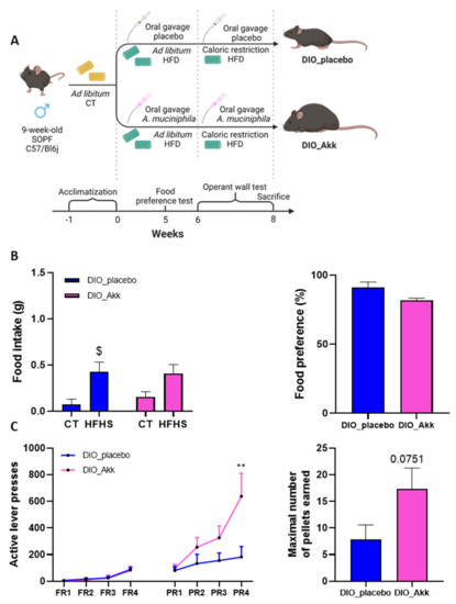 3.3. The Administration of A. muciniphila Improves the Motivational Component of Food Reward Altered by DIO