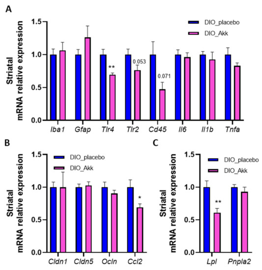 3.4. Beneficial Effects of Akkermansia muciniphila on the Reward System Are Associated with a Reduction in Striatal Inflammation and Lpl Expression