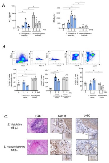 3.1. Different Recruitment and Localization of Ly6ChiCD11b+ Monocytes in the Liver following Infection with E. histolytica or L. monocytogenes