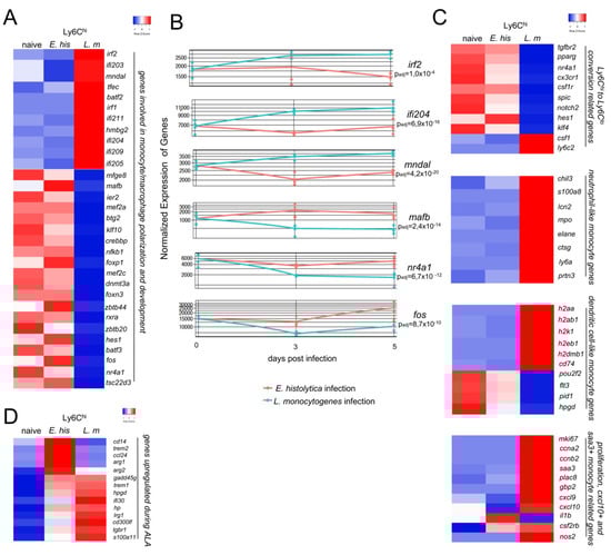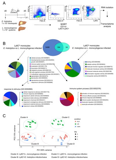 Hepatic monocytes of E. histolytica- or L. monocytogenes-infected C57BL/6 mice were sorted on the indicated days p.i., with a purity of 80–85% and surface staining was performed using CD11b (APC-Cy7; Ly6C (FITC) and Ly6G (APC). Cells were then sorted into collection tubes containing 2 mL of RNAprotect cell reagent (Qiagen). RNA was isolated using the RNeasy Plus Micro Kit (Qiagen) and RNA integrity was analyzed using an Agilent 6000 Pico Kit and an Agilent 2100 Bioanalyzer (Agilent). Samples used for transcriptome sequencing fulfilled the following criteria: total RNA ≥ 200 ng (≥20 ng/µL); RNA integrity number (RIN) ≥7.0, 28S/18S ≥ 1.0. RNA library preparation and sequencing were performed by BGI Genomics, China. The data comprised paired-end short reads. All raw data were aligned to the mouse reference genome GRCm38 Ensembl 85 and the corresponding Gencode annotation using STAR [] (version 2.5.2a). Differential expression analysis was performed in R (version 3.3.3; R Foundation for Statistical Computing, Austria) using DESeq2 (version 1.13.8) []. Reads from different lanes per replicate were combined after checking for the absence of batch effects on a PCA plot. We performed differential gene expression analysis between both infection models within the Ly6Chi and Ly6Clo monocytes respectively using the day after infection as additional co-variate in the DESeq design. To test for differential expression across all three time points (naive, d3 p.i, d5 p.i.), we used a likelihood ratio test for each monocyte group using time point, infection model, and an interaction term for both variables as full design and compared it against the reduced model with the interaction term removed. A threshold of 0.05 for Benjamini–Hochberg corrected p values was used to determine significance by the “statistical overrepresentation test”. Gene set analysis was performed using PANTHER GO-slim (Version 16) [], with p adj < 0.05. Heatmaps were created using http://heatmapper.ca (accessed on 1 July 2019) combining time points 3 and 5. Volcano plots were made using GraphPad Prism V8.4.3.