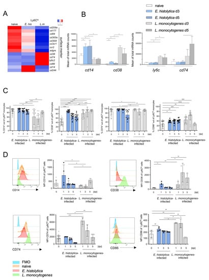 Next, we analyzed the differential expression of genes encoding surface markers that may be useful for further subdivision of Ly6Chi monocytes. We found significant upregulation of genes encoding Ly6c2, Cd38, and Cd74 in Ly6Chi monocytes from L. monocytogenes-infected mice, whereas higher expression of Cd14 was characteristic for Ly6Chi monocytes from E. histolytica-infected mice (Figure 4A,B). The expression of these genes at the protein level on Ly6Chi monocytes from both infection models was validated by flow cytometry. Although not significantly regulated at the transcriptional level, we included the analysis of the co-stimulatory receptor CD86 in the panel to further describe M1 polarization of inflammatory monocyte []. As in monocytes from naïve mice and in agreement with the transcriptomic data, we found that the percentage of CD14-expressing Ly6Chi monocytes was higher and remained higher from d1 p.i. on following E. histolytica infection than in Ly6Chi monocytes from L. monocytogenes-infected mice, the latter initially decreased but increased from d5 of infection (Figure 4C). This picture was mirrored by lower MFIs for CD14 on Ly6Chi monocytes derived from the L. monocytogenes model than on monocytes from the E. histolytica model (Figure 4D). When compared with that in uninfected animals, expression of CD38 increased significantly in both models shortly after infection. However, expression was significantly stronger on monocytes from the L. monocytogenes infection model (Figure 4D). Initially, the percentage of CD74-expressing monocytes remained the same as that in naïve mice following E. histolytica infection, but decreased on d5 p.i. (Figure 4C). During L. monocytogenes infection, expression and MFI of CD74 increased on d1 p.i., but then decreased to the level observed in uninfected animals as infection progressed (Figure 4C,D). The expression and MFI level of CD86 also decreased significantly over time during infection with L. monocytogenes, and to a lesser extent this was also true for monocytes in the E. histolytica model (Figure 4C) (expression on monocytes from spleen, blood, bone marrow see Figure S3A–C).
