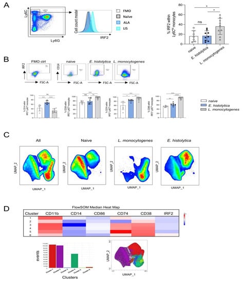 After analysis of the distribution of Ly6Chi monocyte subpopulations by UMAP, initially considering only surface markers, clear demarcation of populations by L. monocytogenes and E. histolytica infection and by naïve animals was seen, with overlapping populations of the latter (Figure 5C). When Irf2 was included, 6 distinct clusters were identified (Figure 5D). A distinct IRF2-positive monocyte population and a greater heterogeneity in the area of monocytes from the listeria model and a clear delineation of monocyte populations from naive and E. histolytica-infected animals could be visualized in the UMAP analysis after clustering with FlowSOM and Cluster Explorer analysis (Figure 5D).