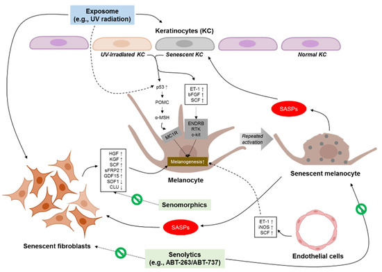 - Yoon, J.E.; Kim, Y.; Kwon, S.; Kim, M.; Kim, Y.H.; Kim, J.H.; Park, T.J.; Kang, H.Y. Senescent fibroblasts drive ageing pigmentation: A potential therapeutic target for senile lentigo. Theranostics 2018, 8, 4620–4632. [Google Scholar] [CrossRef]