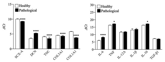 TSPCs were extracted, harvested, and characterized by flow cytometry. The analysis indicated that both healthy and pathological tissue-derived TSPCs expressed positive mesenchymal stem cells surface markers (CD90, CD73) and CD105 (a TGF-β receptor accessory molecule), but negative for CD45, HLA-DR, CD34, and CD14, except for pathological TSPCs that showed positivity for CD14 [36] (see Figure 1). Moreover, at day 0, before treatment, compared to healthy TSPCs, pathological TSPCs showed slight but significant (p < 0.0001) downregulation of tendon specific markers, except for DCN (a component of tendon ECM) that was upregulated (p < 0.0001). However, we found overexpression of some pro-inflammatory cytokines, such as IL-6 (p < 0.0001) and TNF (p < 0.05), in pathological cells, compared to healthy ones (see Figure 2), suggesting that TSPCs can regulate inflammation during tendon healing [37].