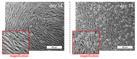 TSPCs morphological investigation indicated a different shape between healthy and pathological tissue-derived TSPCs, as observed in Figure 3. Indeed, cells extracted from healthy tendons showed specific alignment and elongated shape modification (fibroblast-like), whereas cells obtained from pathological tendons exhibited a smaller cell body with thin dendrites in the perinuclear area, especially after 14 days of culture. However, the different morphology between healthy and pathological tissue-derived TSPCs was already evident at day 0, when β-actin staining was used to visualize cells’ cytoskeleton.