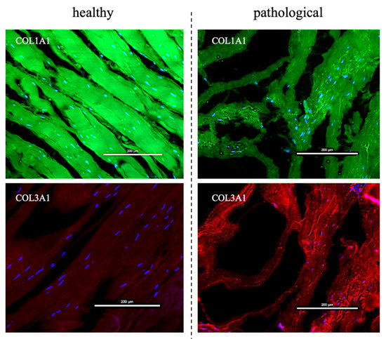 The described pathological cell shape suggested an impaired metabolism, which may lead to an impaired extracellular matrix ECM. Indeed, tendon ECM is mainly formed by multilevel organized collagen. This protein forms fiber-like structures at a number of different hierarchical levels, each aligned closely to the long axis of the tissue (the loading direction), conferring excellent uniaxial mechanical strength to the tendon [44]. A prevalence of organized fibers of type I collagen was found in healthy tendons when compared to tendinopathic tissue samples, which mainly expressed type III collagen. Type I collagen is the most abundant into the tendon matrix. It is the major component of tendon tissue (75–85% of the dry mass of tendon) and is responsible for its mechanical strength. Type III collagen, on the contrary, has a role in tendon healing. It is mainly responsible for fibrotic and scarred tissue arrangement and has been consistently reported at the rupture site of human tendons. The presence of this collagen type is thought to cause weakening in the tendon tissue, since its fibers are thinner and more extensive than those of type I [45,46].