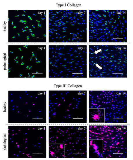 Immunofluorescence images of healthy and pathological tissue-derived tendon stem/progenitor cells (TSPCs) cultured in a medium supplemented with T3 (10−6 M) up to 14 days. Type I (green) and III (red) collagen expression was monitored. DAPI was used to counterstain the nuclei (blue). Pathological cells exhibited an ovoid morphology (white arrow) and tended to form aggregates with enhanced type III collagen secretion (zoomed area: 150%). Scale bar: 200 µm.
