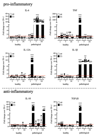 Cytokines gene expression profile of healthy and pathological TSPCs cultured in a medium supplemented with T3 up to 14 days was also monitored, and data are summarized in Figure 7. Compared to healthy, pathological tendons, cells showed upregulation of pro-inflammatory cytokines with significant overexpression of TNF (180-fold), IL-12A (13-fold), and IL-1β (10-fold) at Day 7; upregulation of IL-6 (25-fold) and IL-1β (18-fold) was noted at Day 7. Pathological cells also showed significant overexpression of anti-inflammatory ones, such as IL-10 (50-fold at Day 1 and 35-fold at Day 14) and TGF-β1 (20-fold) at Day 1 of culture. Conversely, healthy cells did not show any significant event of cytokines overexpression.