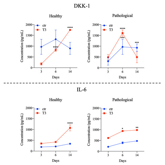 Cytokine levels were also measured by immunoassay, as shown in Figure 9 and Figure S1. In supernatants of healthy tissue-derived TSPCs treated with T3, DKK1 levels were significantly increased at Days 6 and 14, while IL-6 only at Day 14. Pathological TSPCs showed higher production of DKK-1 at Days 6 and 14 even when cultured in standard medium, dropping at Day 14 in the presence of T3. IL-6 remained significantly increased from Days 6 to 14 (Figure 9). For other cytokines explored, we did not find any significant event of overexpression either in healthy or pathological cells (see Figure S1 of Supplementary Materials).
