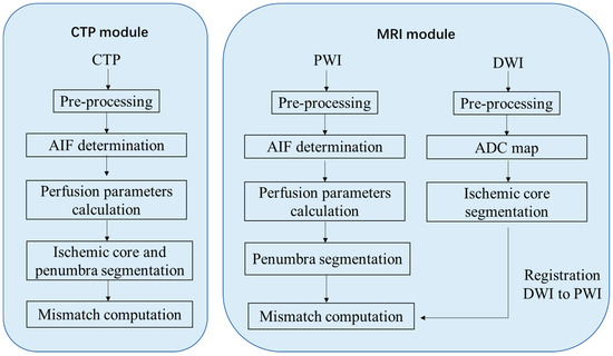 Computed tomographic perfusion (CTP) as well as MRI techniques of diffusion-weighted imaging (DWI) and perfusion-weighted imaging (PWI) have been used for the management of acute ischemic stroke (AIS) [1,2,3,4]. Software packages that can automatically postprocess perfusion imaging were developed to facilitate radiologists and medical doctors in making timely and precise clinical decisions about AIS treatment [1]. These packages compute perfusion maps including relative cerebral blood volume (rCBV), relative cerebral blood flow (rCBF), mean transit time (MTT) and time to maximum peak (Tmax) [5]. These perfusion maps represent hemodynamic properties, and they are used to determine ischemic core and penumbra regions [6].