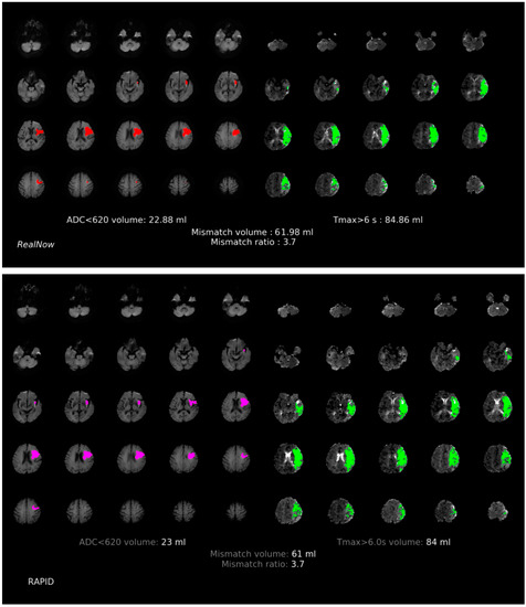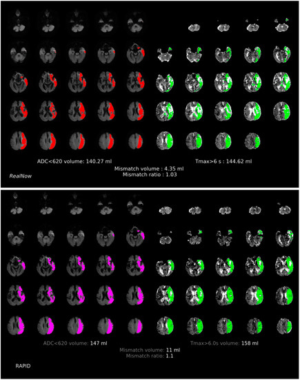 This study aimed to assess the differences between two packages: RAPID and RealNow (Dr. Brain, China), in terms of volumetric estimation and patient stratification based on CTP and MRI data. Similar to RAPID, RealNow is an automated postprocessing package for perfusion imaging, and it has been applied in some clinical centers with no access to RAPID.