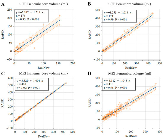 Scatter plots of ischemic core (A) and penumbra volumes (B) in CTP group, ischemic core (C) and penumbra volumes (D) in MRI group.