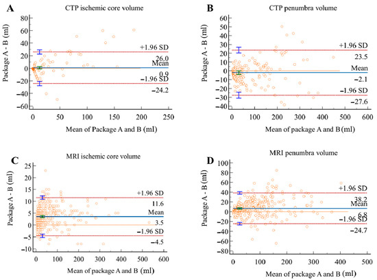 Bland–Altman plots for volumetric agreement of ischemic core (A) and penumbra volumes (B) in CTP group, ischemic core (C) and penumbra volumes (D) in MRI group. Solid lines represent the mean difference between two packages. Dotted lines represent 95% limits of agreement.