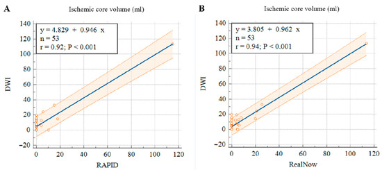 Scatter plots of ischemic core volumes estimated with RAPID versus follow-up DWI (A) and RealNow versus follow-up DWI (B).