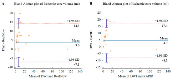 The volumes of ischemic core and penumbra obtained from packages were compared. We performed the Wilcoxon test with a p-value of <0.05 as statistically significant. The Bland–Altman analysis and intraclass correlation coefficients (ICC) were employed to evaluate the agreement between package A and B as well as agreement between both packages and follow-up DWI. ICC were interpreted as proposed: <0.50 (poor), 0.50–0.75 (moderate), 0.75–0.90 (good) and >0.90 (excellent).
