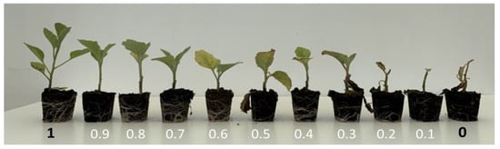 Evaluation of symptoms was assessed on each plant 30 days after inoculation (DAI), according to a scale (compared with mock inoculated controls, from Barbierato et al. [39]) ranging from 1 to 0, where 1 corresponds to “fully resistant plant with complete absence of symptoms”, 0 to “dead plant”, and with the intermediate values as follows: 0.9 = some yellowing spots in basal leaves, absence of symptoms in intermediate and upper ones; 0.8 = extended yellowing in basal leaves; 0.7 = extended yellowing in basal leaves and some yellowing spots in intermediate ones; 0.6 = extended yellowing in both basal and intermediate leaves; 0.5 = some necrosis spots in basal leaves, extended yellowing in basal and intermediate ones and some spots of yellowing in upper ones; 0.4 = partial necrosis in basal leaves, extended yellowing in intermediate and upper ones; 0.3 = necrosis in basal leaves and some necrosis spots in intermediate ones; 0.2 = necrosis in basal and intermediate leaves, falling of basal ones; 0.1 = complete necrosis in all the leaves, falling of basal and intermediate ones (Figure 1).