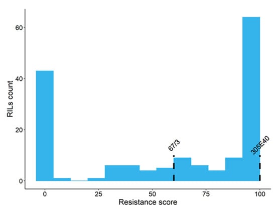 Distribution of the resistance score in the RIL population. The scores values of the two parental lines ‘67/3’ and ‘305E40’ are highlighted with dashed lines.