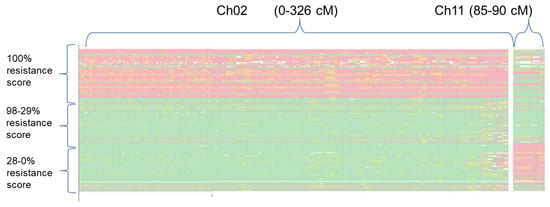 Haplotype distribution in the RIL population of all GBS markers mapped on CH02 (0–326 cM) and CH11 (85–90 cM) was ordered according to their resistance scores (on the left panel, descending from 100% to 0). Each line represents RIL progeny. In red, haplotype of ‘305E40’; in green haplotype of ‘67/3’; in yellow heterozygous markers; in white, missing data.