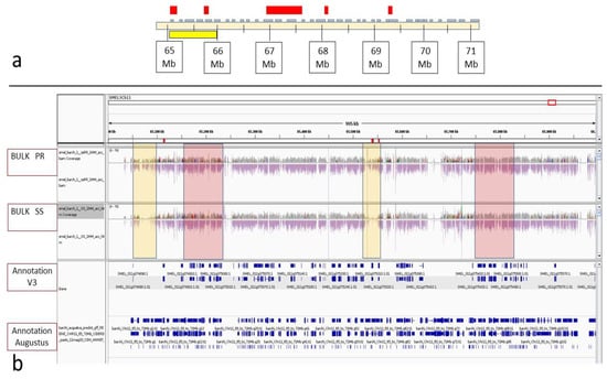 Example of IGV visual score in the region spanning 65 and 66 MB on chromosome 11. (a) In the upper panel, the region ranging from 63–71 Mb comprising within the CI of the FomCH11 QTL is represented. The yellow box depicts the region zoomed in the box below. The red boxes indicate the position of the 5 differentially enriched regions highlighted from BSA-seq analyses. (b) Read alignments of the two bulks PR (on the top) and SS (bottom) against the reference sequence of ‘67/3’ are shown, together with the annotated genes according to V3 genome sequence ([35], top) and the additional Augustus annotation (bottom), also including TE-related genes. The two yellow rectangles highlight two differentially enriched regions between bulks of PR and SS (i.e., with different read coverages detectable when comparing upper and lower panels), while the pink rectangles highlight the position of two non-enriched ones.