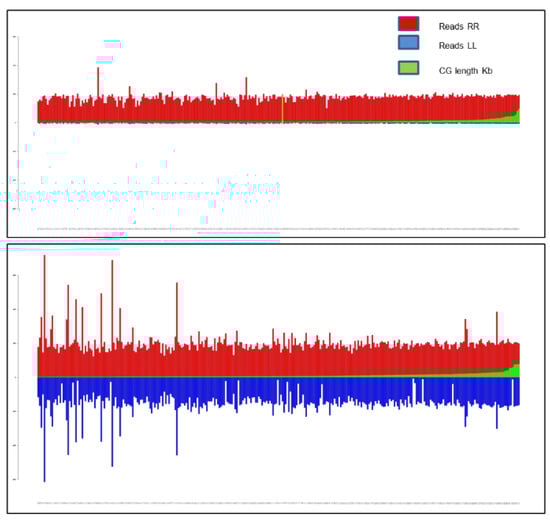 Graphical representation of selected contig coverage in the asm_305 assembly. Upper panel: Contigs exhibiting a ratio of mapped RR vs. SS reads of a least 30 (log2 > 4.90) are shown. Lower panel: contigs exhibiting a ratio of RR vs. SS reads < 30 are shown. For both panels, contigs are ordered by increasing the length along the X axis. RR, SS and contig length are represented as red, blue and green bars, respectively.
